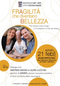 Sabato 21 febbraio l’Ufficio di Pastorale familiare ha invitato in diocesi Amerigo Basso e Laura Lucchin, genitori di Sammy, il giovane ricercatore scientifico affetto da progeria, venuto a mancare il 5 ottobre 2024.