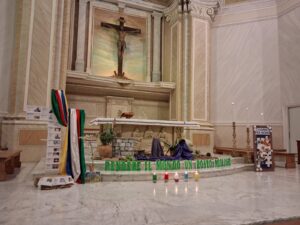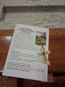 A conclusione della Veglia sono stati letti i 17 martiri ufficiali del 2025 e per ogni nome – accompagnato da un breve racconto del sacrificio – è stata deposta una candela ai piedi della croce. Durante il canto finale il gruppo missionario di Fossacesia ha offerto una caratteristica croce in cuoio con sopra incisa la frase: “Rendere il mondo un posto migliore”. Davvero un momento intenso di riflessione e di preghiera.