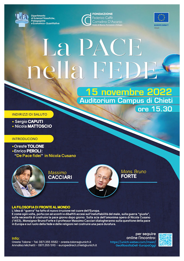 Impegni del Vescovo Convegno all’Universita “G. d’Annunzio” di Chieti martedì 15 Novembre Descrizione: Alle ore 15.30 dialoga con Massimo Cacciari su “La pace nella fede” presso l’Auditorium dell’Università “G. d’Annunzio” di Chieti Inizio: 15/11/2022 15:30 Fine: 15/11/2022 18:00 Categorie: Impegni del Vescovo Città: Chieti Regione: Abruzzo Paese: Italia FacebookTwitteremailPrint